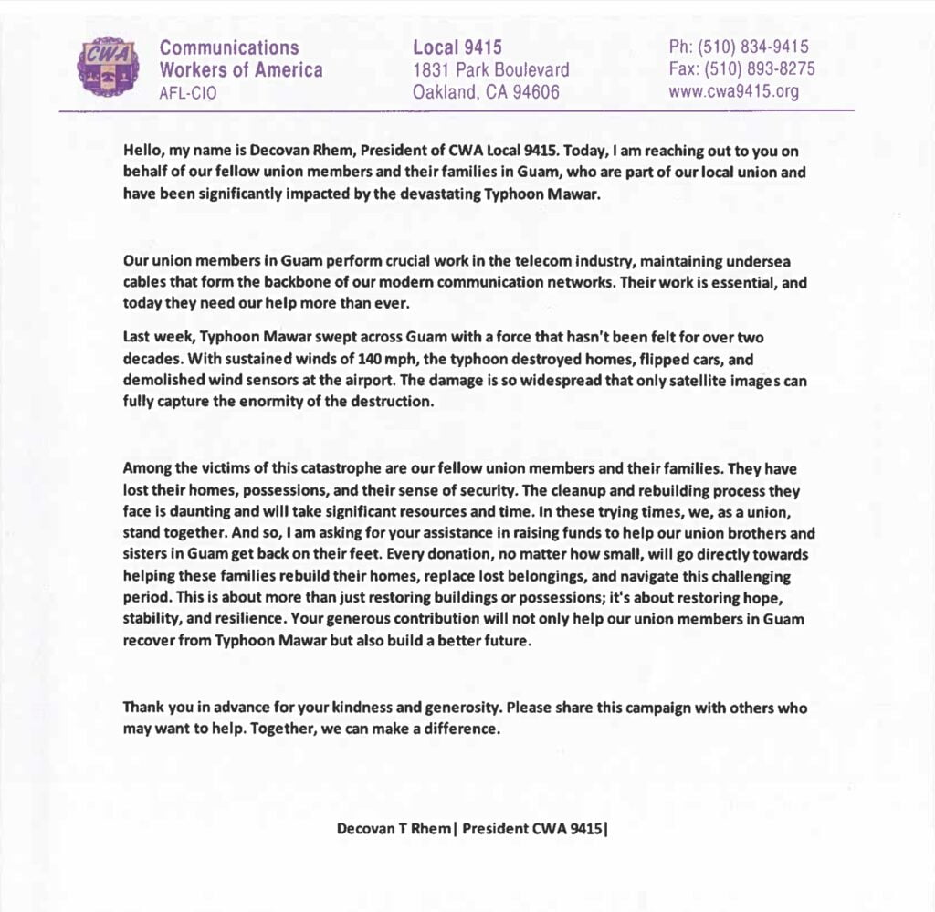 Please take a moment to read the attached letter from Decovan Rhem, president of CWA Local 9415, on behalf of our members and their families in Guam, who have been significantly impacted by Typhoon Mawar.